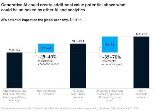 据麦肯锡《生成式人工智能的经济潜力》报告显示,生成式AI可提升850个职业的2100个具体工作的生产效率,生产成本降低可以高达6.1到7.9万亿美元。对于企业来讲,它可以被运用到16个业务部门的63个场景中解决具体的业务挑战,为企业带来2.6到4.4万亿美元的价值。