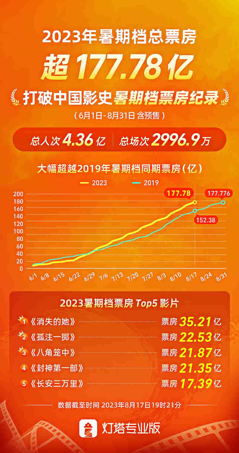 据灯塔专业版数据,截至8月17日19时21分,2023年暑期档总票房超177.78亿,超2019年暑期档票房成绩,打破中国影史暑期档最高票房纪录。截至目前,暑期档观影总人次4.36亿,总场次近3000万,共4部影片在暑期档突破20亿元,创下中国影史暑期档新高。