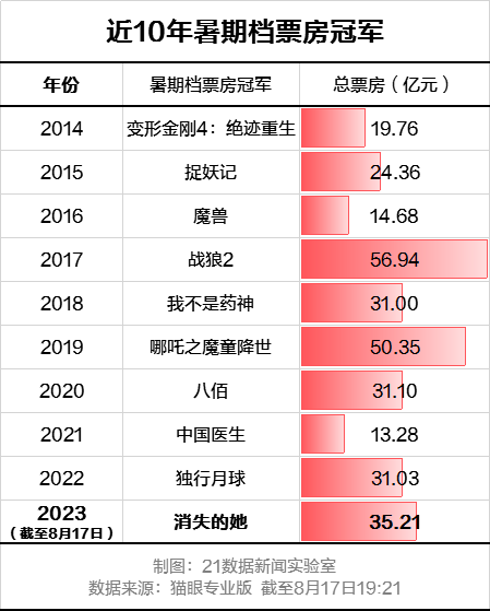 作为时间跨度最长的大档期,暑期档也更容易催生“年度爆款”。2015年的《捉妖记》、2017年的《战狼2》、2019年的《哪吒之魔童降世》、2020年的《八佰》,都是年度票房冠军。