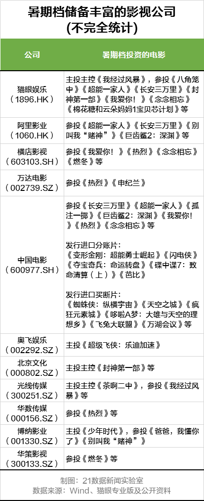 从主要出品方来看,中国电影、猫眼娱乐、阿里影业、万达电影、横店影视、光线传媒、博纳影业等影视传媒公司均有主投/参投电影在暑期上映。