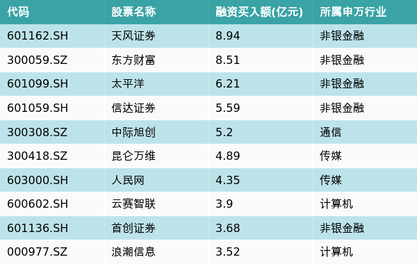 8月17日,两市共有3267只个股有融资资金买入,其中天风证券、东方财富、太平洋排名前三,买入金额分别8.94亿元、8.51亿元、6.21亿元。融资买入额前10个股详情见下表: