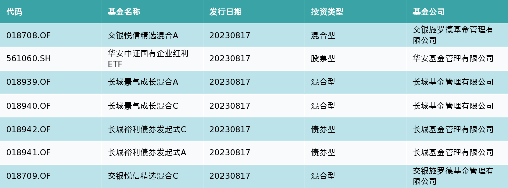 8月17日有7只新基金发行,分别为:交银悦信精选混合A、华安中证国有企业红利ETF、长城景气成长混合A、长城景气成长混合C、长城裕利债券发起式C、长城裕利债券发起式A、交银悦信精选混合C,详情见下表: