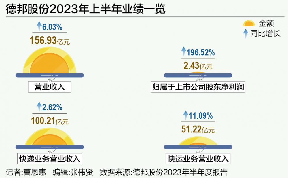 德邦股份的主营业务分为快递、快运以及仓储供应链。今年上半年,这几大业务板块营收均实现增长。其中,该公司快递业务实现营业收入100.21亿元,同比增长2.62%;快运业务实现营业收入51.22亿元,同比增长11.09%。