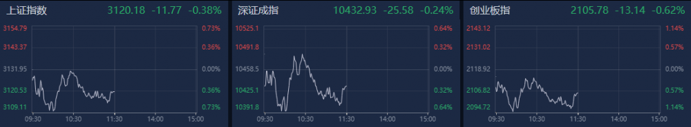 A股上午弱势震荡,创业板指盘中跌超1%。南财金融终端显示,截至上午收盘,上证指数跌0.38%,深证成指跌0.24%,创业板指跌0.62%。沪深两市个股涨多跌少,近2800只个股上涨。
