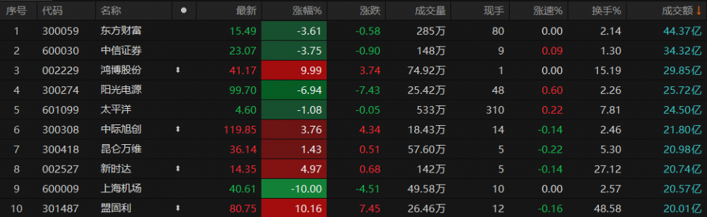 沪深两市半天成交额4238亿元,较上一交易日同期缩量236亿元。个股方面,截至午间收盘,东方财富成交额排名第一,达44.37亿元;中信证券、鸿博股份、阳光电源、太平洋成交额居前,分别为34.32亿元、29.85亿元、25.72亿元、24.50亿元。