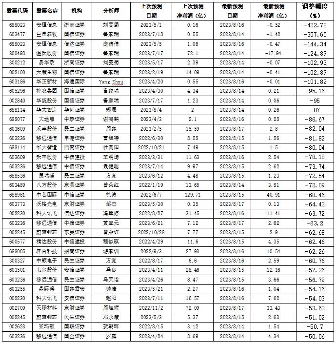 被下调盈利预测值幅度超50%的公司