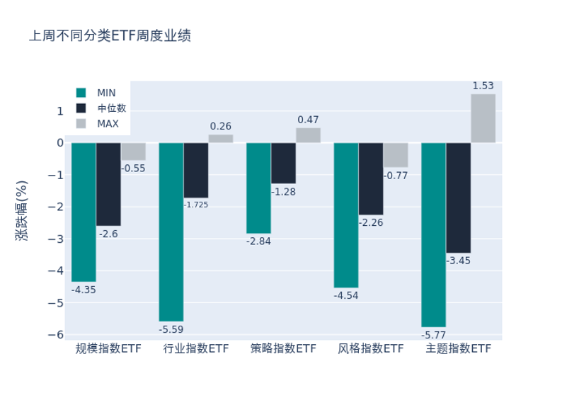 上周股票型ETF周度收益率中位数为-2.76%。其中按照不同分类,规模指数中景顺长城纳斯达克科技ETF(QDII)周度收益率最高,为-0.55%;行业指数中电力ETF周度收益率最高,为0.26%;策略指数中华泰柏瑞上证红利ETF周度收益率最高,为0.47%;风格指数中华夏中证智选500价值稳健策略ETF周度收益率最高,为-0.77%;主题指数中国防ETF周度收益率最高,为1.53%。