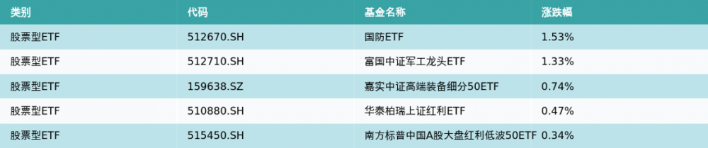 上周股票型ETF涨幅最高的5支ETF及其收益率分别为:国防ETF(1.53%)、富国中证军工龙头ETF(1.33%)、嘉实中证高端装备细分50ETF(0.74%)、华泰柏瑞上证红利ETF(0.47%)、南方标普中国A股大盘红利低波50ETF(0.34%)。详情见下表: