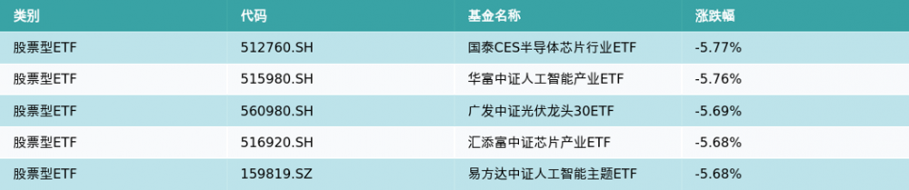 上周股票型ETF跌幅最大的5支ETF及其收益率分别为:国泰CES半导体芯片行业ETF(-5.77%)、华富中证人工智能产业ETF(-5.76%)、广发中证光伏龙头30ETF(-5.69%)、汇添富中证芯片产业ETF(-5.68%)、易方达中证人工智能主题ETF(-5.68%)。详情见下表: