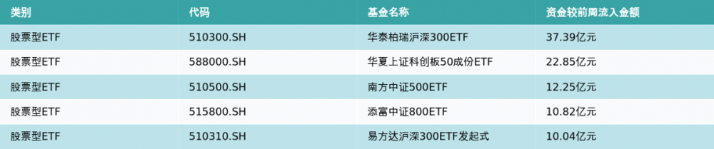 上周股票型ETF资金流入最多的5支ETF及其流入金额分别为:华泰柏瑞沪深300ETF(流入37.39亿元)、华夏上证科创板50成份ETF(流入22.85亿元)、南方中证500ETF(流入12.25亿元)、添富中证800ETF(流入10.82亿元)、易方达沪深300ETF发起式(流入10.04亿元)。详情见下表: