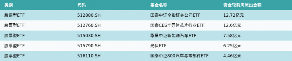 上周股票型ETF资金流出最多的5支ETF及其流入金额分别为:国泰中证全指证券公司ETF(流出12.72亿元)、国泰CES半导体芯片行业ETF(流出12.6亿元)、华夏中证新能源汽车ETF(流出7.58亿元)、光伏ETF(流出6.25亿元)、国泰中证800汽车与零部件ETF(流出4.46亿元)。详情见下表: