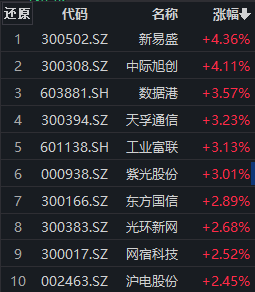 通信板块早盘震荡走高。相关指数中,中证5G通信主题指数 (931079)盘中涨超1%。截至发稿,成分股多数上涨,新易盛、中际旭创涨超4%,数据港、天孚通信、工业富联、紫光股份涨超3%,东方国信、光环新网、网宿科技、沪电股份涨逾2%。
