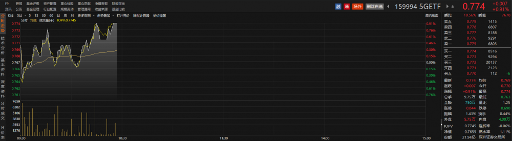 跟踪中证5G通信主题指数的5GETF(159994)盘中走高,截至发稿,上涨0.91%,成交额为750万元。