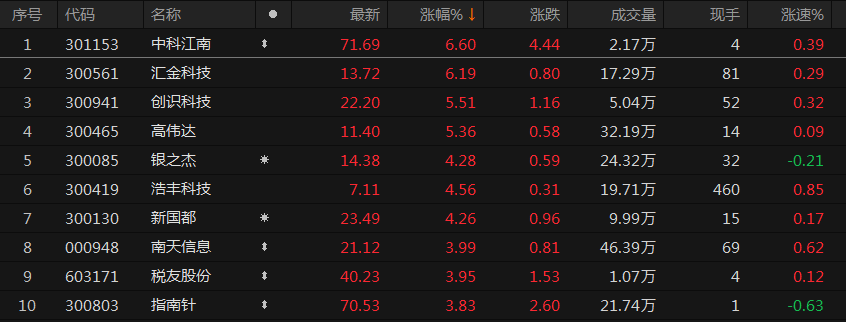 相关指数方面,计算机软件成分股权重超51%的中证金融科技主题指数(930986.CSI)高开,盘中走高,成分股普遍上涨,其中中科江南、汇金科技涨超6%,创识科技、高伟达涨超5%,银之杰、浩丰科技、新国都、南天信息等跟涨。