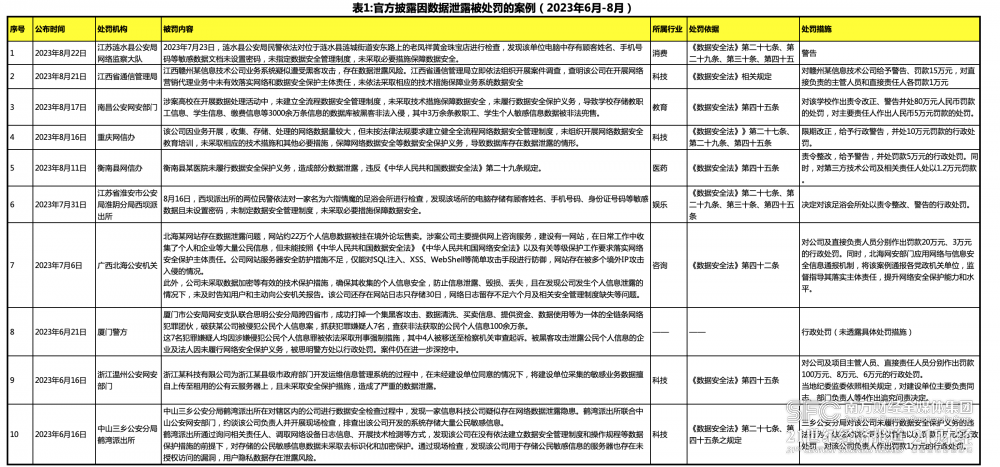 各地陆续出现适用《数据安全法》的相关案例,记者梳理了今年6月以来,各地监管部门陆续披露的关于数据泄露的相关处罚案件(详见表1)。梳理发现,此番数据泄露治理所涉企业多见于日常生活之中,科技、教育、快消等行业均有涉及,处罚措施多以警告、整改和罚款,最高罚款100万元。责任划分也更加细致,数据管理者和运营者都面临处罚。同时,未做好安全防护、未按规定落实主体保护责任的企业,也被处罚。