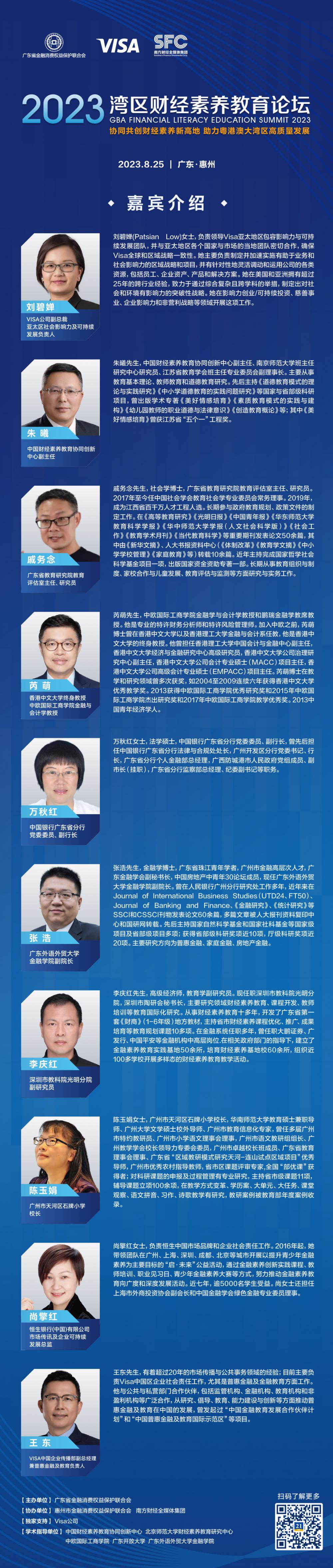 在主题演讲环节,Visa公司副总裁、亚太区社会影响力及可持续发展负责人刘碧婵,中国财经素养教育协同创新中心副主任、南京师范大学教授朱曦,广东省教育研究院教育评估室主任戚务念,中欧国际工商学院金融与会计学教授、香港中文大学终身教授芮萌等多位嘉宾将围绕“大湾区财经素养教育发展前景”“推动金融消保和金融素养教育工作高质量发展”等主题发表主旨演讲。