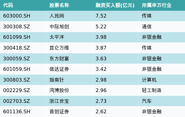 8月23日,两市共有3273只个股有融资资金买入,其中人民网、中际旭创、太平洋排名前三,买入金额分别7.52亿元、5.22亿元、3.98亿元。融资买入额前10个股详情见下表: