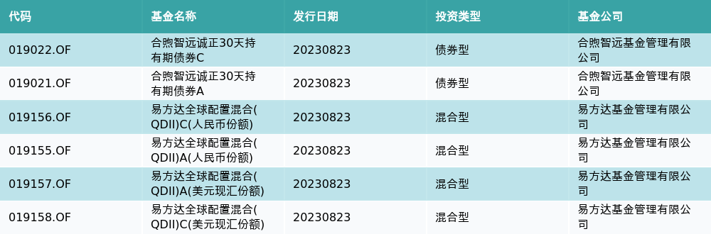 8月23日有6只新基金发行,分别为:合煦智远诚正30天持有期债券C、合煦智远诚正30天持有期债券A、易方达全球配置混合(QDII)C(人民币份额)、易方达全球配置混合(QDII)A(人民币份额)、易方达全球配置混合(QDII)A(美元现汇份额)、易方达全球配置混合(QDII)C(美元现汇份额),详情见下表: