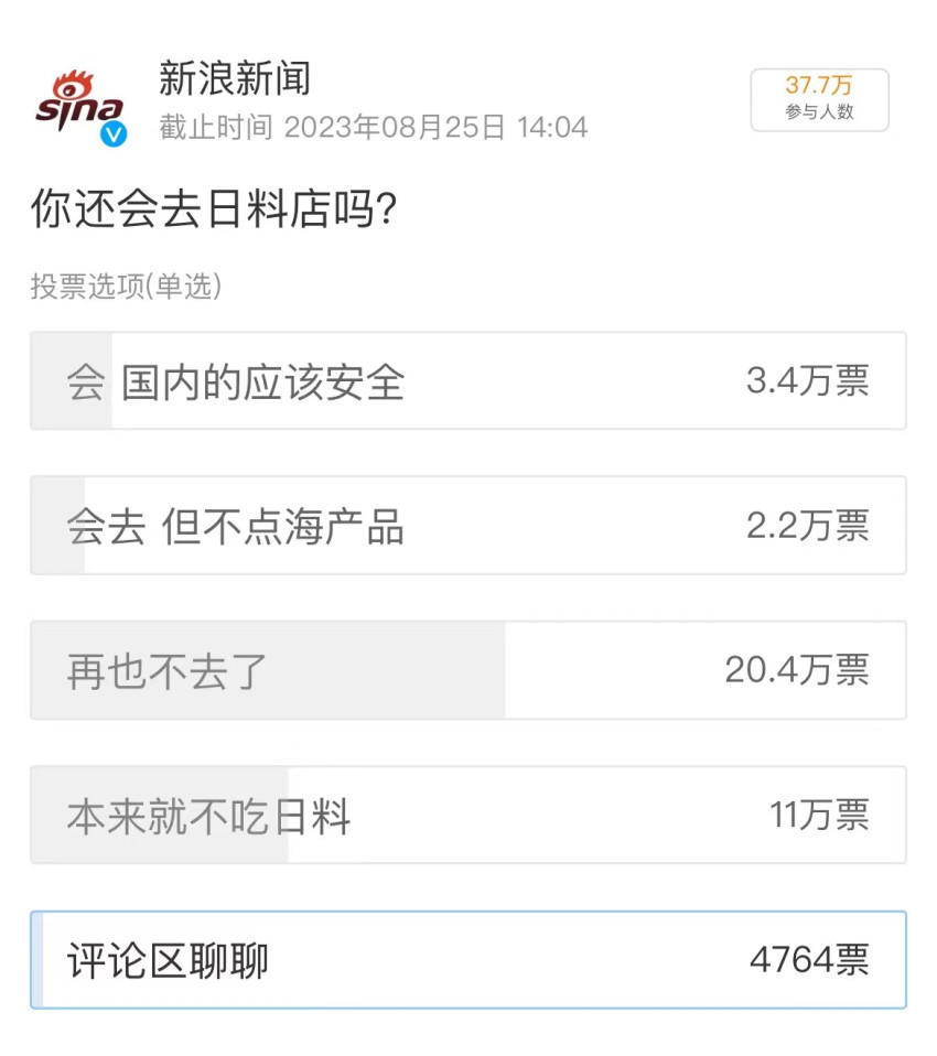 △超一半消费者表示“再也不去日料店”图源:新浪微博8月24日下午,新浪微博发起“你还会去日料店吗?”的投票,截至18时,共计41.6万人投票。其中,20.4万人表示“再也不会去”,占总人数的54.08%;仅3.7万人表示“会,国内的应该安全”,占总人数的0.08%。