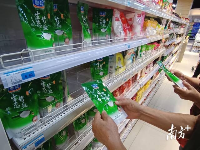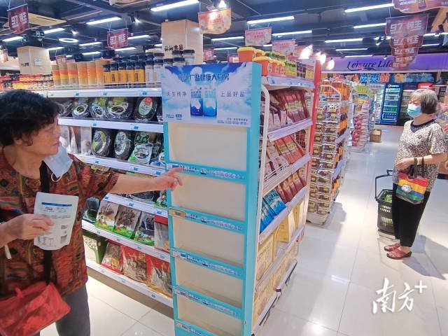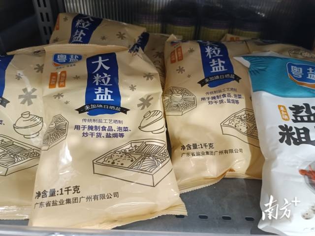 8月25日上午,南方+记者走访位于广州农林下路的“永旺”超市和位于广州大道北的兴安超市,现场看到部分种类的食用盐货架出现空缺,工作人员告诉记者正在进行陆续补充。