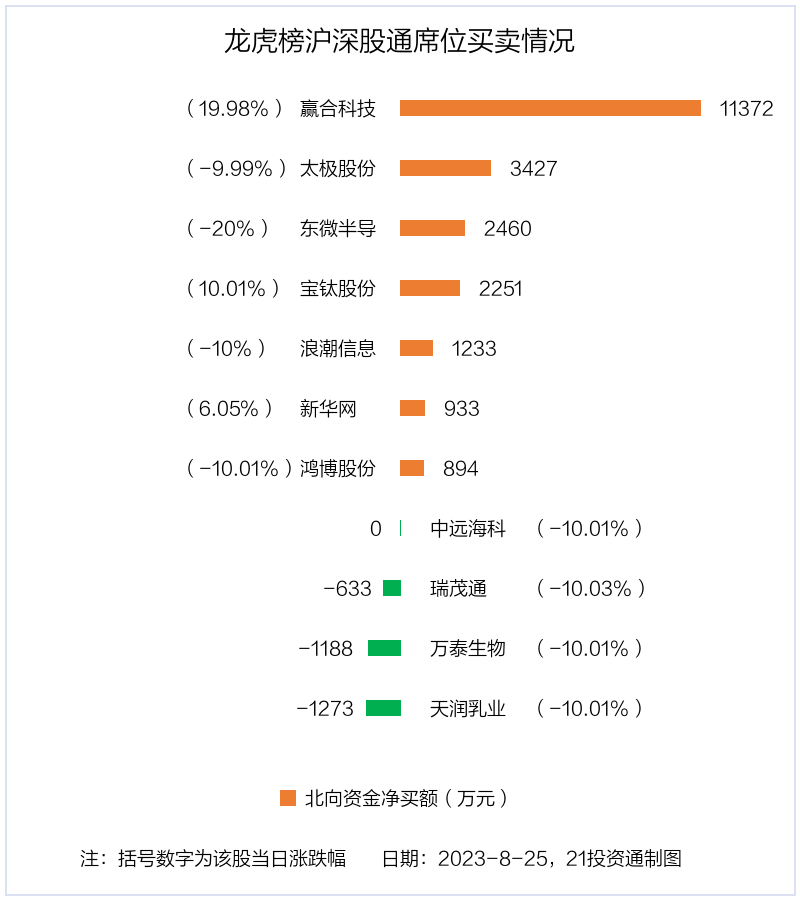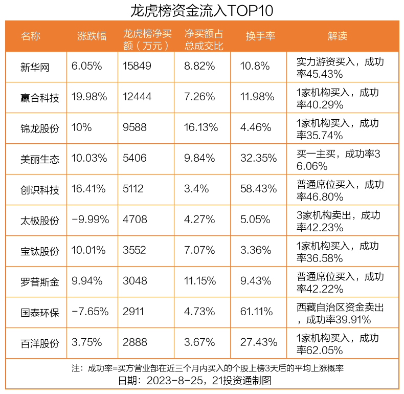 8月25日,上证指数下跌0.59%,深证成指下跌1.23%,创业板指下跌1.17%。盘后龙虎榜数据显示,共有49只个股因当日异动登上龙虎榜,资金净流入最多的是新华网(603888.SH),达1.58亿元。