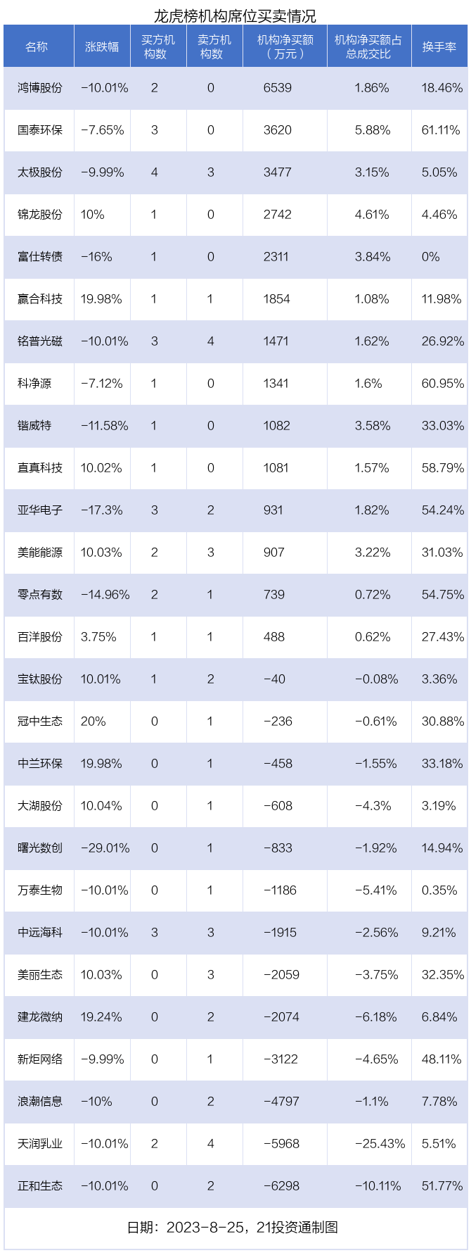 其中,机构净买入金额最多的是鸿博股份(002229.SZ),当日收盘下跌10.01%,换手率为18.46%。