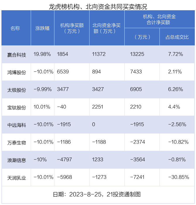 值得注意的是,机构和北向资金共同净买入了赢合科技、太极股份、鸿博股份等3股;共同净卖出了万泰生物、天润乳业等2股;在宝钛股份,浪潮信息,中远海科上出现分歧,机构净卖出宝钛股份40.45万元,北向资金净买入2250.85万元;机构净卖出浪潮信息4796.83万元,北向资金净买入1232.69万元;机构净卖出中远海科1915.49万元,北向资金净买入0.07万元。