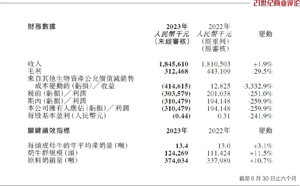 2023年1-6月,其原料奶销售均价达4311元/吨,同比下降7.6%。