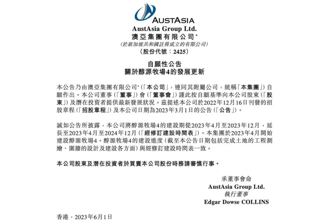 《21CBR》记者注意到,澳亚也于6月公告,称“淳源牧场4”将推迟一年建成。