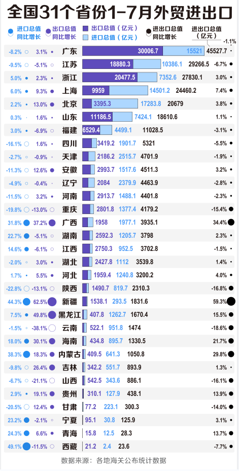 不过,虽然全球主要经济体景气度继续回落,外需不振,我国整体外贸数据趋冷,但各省份外贸表现仍有不少亮点,广东、江苏、浙江、上海、北京、山东、福建7省份今年1-7月外贸进出口总额超过万亿元人民币。