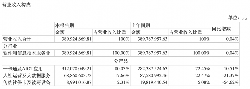 在业务结构上,一卡通及AIOT应用业务实现收入3.12亿元,占营收比重提升至80.03%,同比增加10.51%;传统社保卡及读写设备继续压降至2.31%,同比减少54.62%;人社运营及大数据服务业务实现收入0.69亿元,同比减少21.73%。
