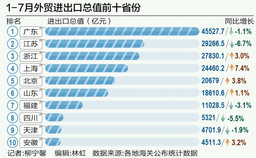 不过,虽然全球主要经济体景气度继续回落,外需不振,我国整体外贸数据趋冷,但各省份外贸表现仍有不少亮点,广东、江苏、浙江、上海、北京、山东、福建7省份今年1-7月外贸进出口总额超过万亿元人民币。
