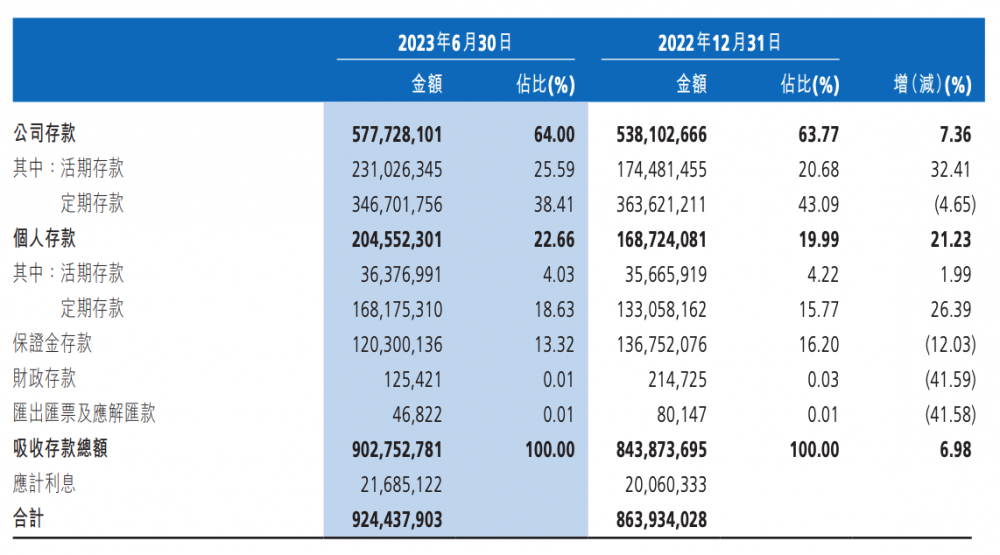 资产负债表显示,截至6月末,渤海银行存款在总负债中的占比为58.64%,较2022年末提升2.88个百分点。