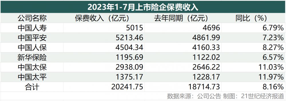 近日,各大上市险企陆续披露1-7月保费收入公告,据21世纪经济报道记者统计,2023年1-7月中国人寿、中国平安、中国人保、新华保险、中国太保及中国太平六家上市险企共揽保费20241.75亿元,较去年同期的18714.73亿元增长8.16%。人身险业务保费延续高增长态势,财险业务保费增速回落,且各公司有所分化。