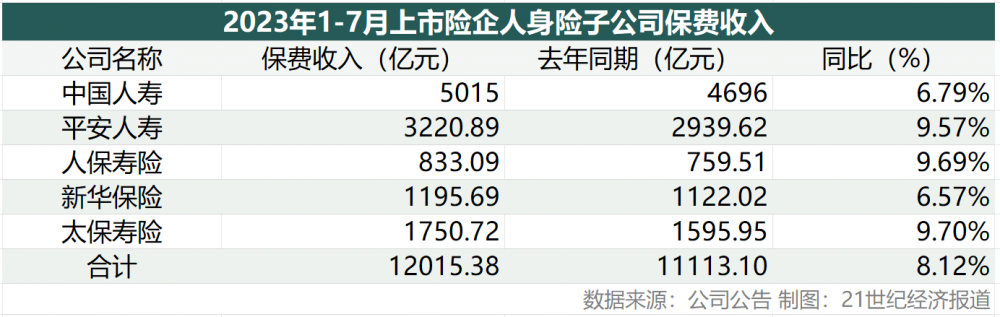 1-7月,五家A股上市险企人身险子公司合计实现保费收入12015.38亿元,较上年同期增长8.12%。