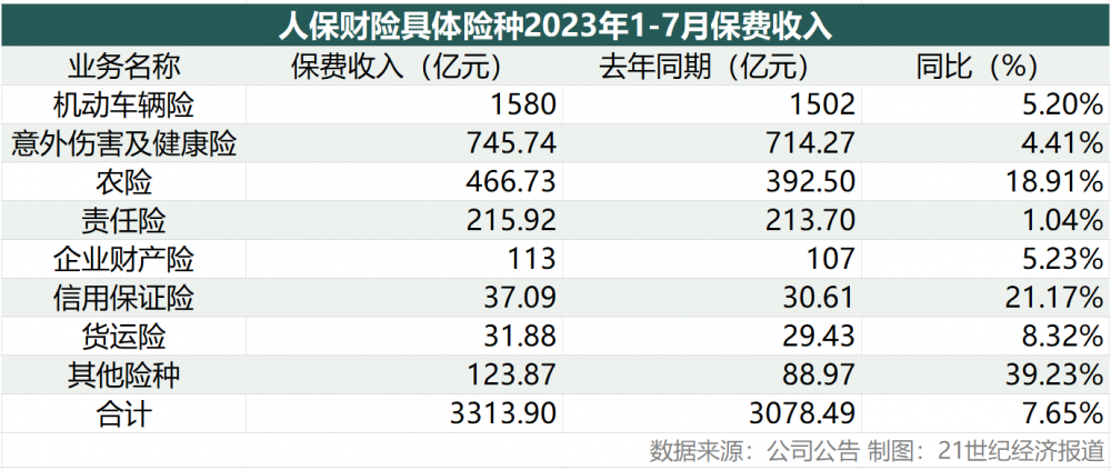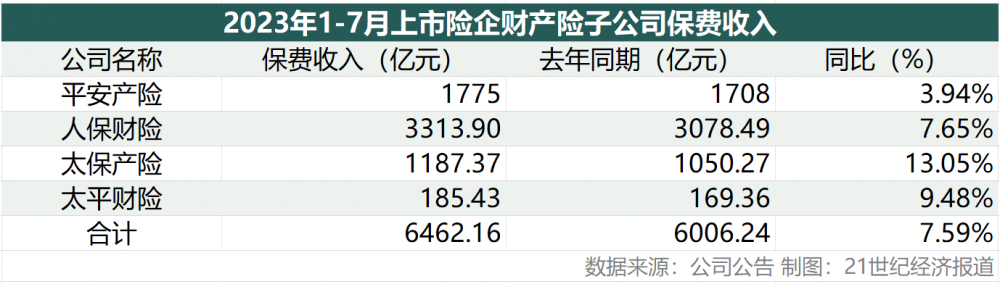具体来看,平安产险1-7月保费收入1775亿元,同比增长3.94%;人保财险保费收入3313.90亿元,同比增长7.65%;太保产险保费收入1187.37亿元,同比增长13.05%;太平财险保费收入185.43亿元,同比增长9.48%。