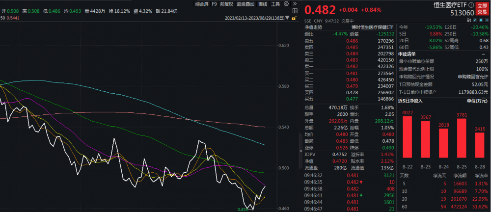 成分股方面,涨幅方面,爱康医疗涨超4%,长江生命科技、开拓药业-B、固生堂涨超3%,百济神州、平安好医生等跟涨。跌幅方面,再鼎医药、诺辉健康、欧康维视生物-B跌幅居前。