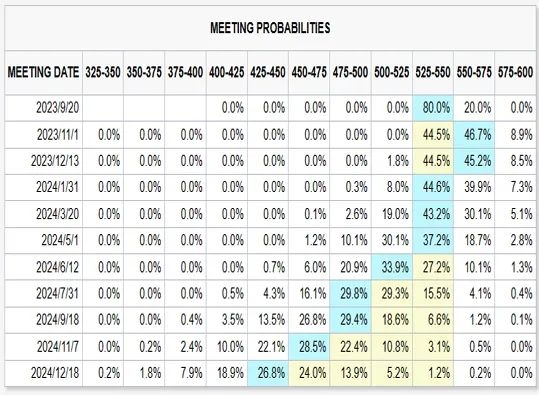 ▍图5:当前仍处于停止加息观察期,利率期货显示9月大概率不加息,11月可能加息