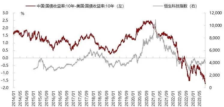 ▍图7:恒生科技指数与中美利差正相关,中美利差有企稳迹象