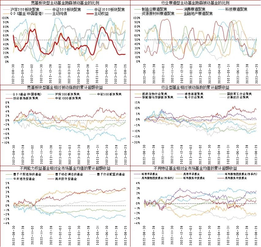 注:主动基金跑赢被动基金的比例是指,每日滚动计算,该分类下,有多少比例的主动基金近一个月收益率大于相应的被动基金。累计超额收益是指,主动基金均值相对于被动指数的累计超额收益,假设一年前的数据是0。