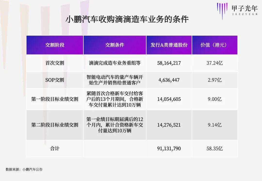 此次小鹏汽车收购滴滴智能汽车业务将以发行股票的方式进行。公告显示,小鹏汽车将向滴滴发行91131790股A类普通股,占公司扩大后股本约5%。发行股票将分为4个阶段完成。