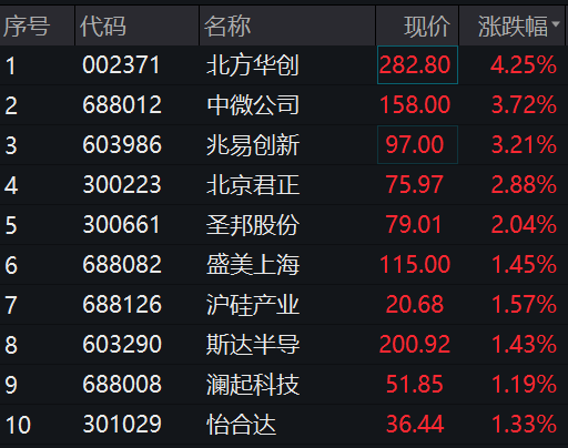 其中,北方华创涨超4%,中微公司、兆易创新涨超3%,北京君正、圣邦股份、盛美上海、沪硅产业等股跟涨。