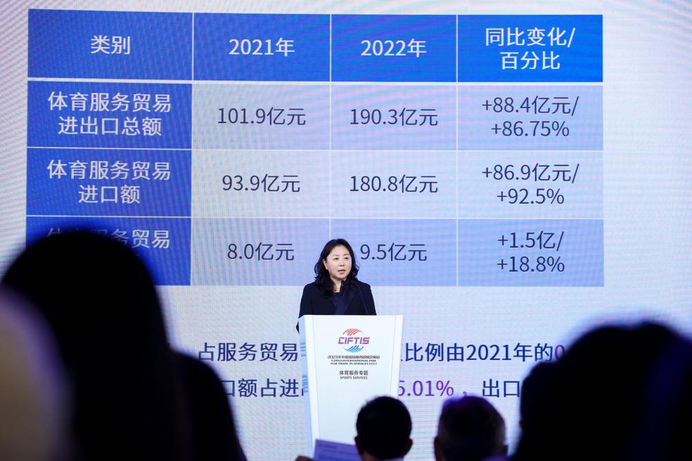 杨雪鸫在发布《报告》时提到,2022年中国体育服务贸易进出口总额同比显著上升,达到三年来最高水平,同时在中国服务贸易进出口中的占比也呈现回升态势,今后中国体育服务贸易发展将继续保持健康增长态势,成为中国服务贸易发展的新特色与新亮点。