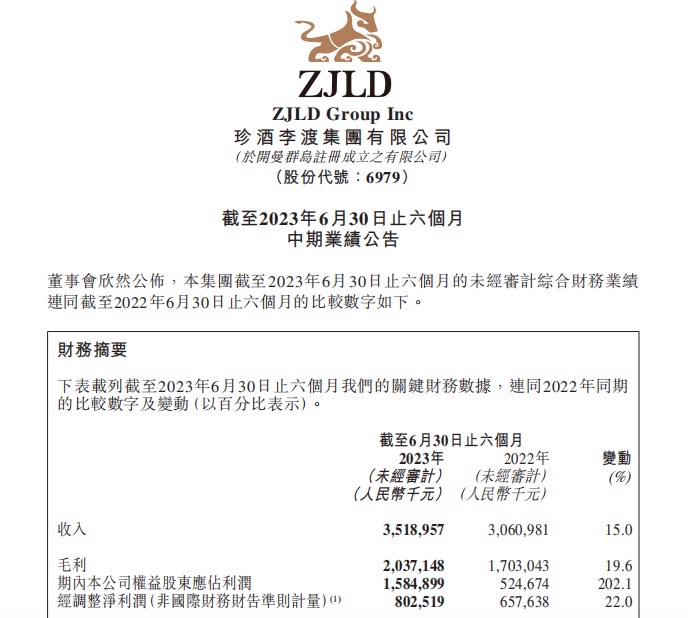 一周前,珍酒李渡集团交出了上市以来的首份业绩“答卷”,1-6月,公司实现营业收入35.19亿元,同比增长15%;经调整净利润为8.03亿元,同比增长22%。
