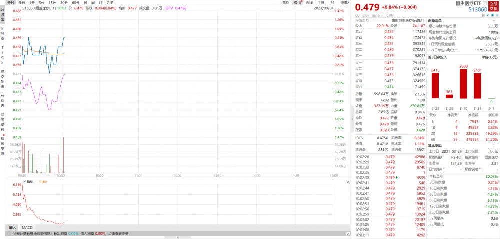 作为跟踪该指数的唯一只场内ETF,恒生医疗ETF(513060)现涨0.84%,盘中交投活跃,成交额近3亿元,当前溢折率0.84%。