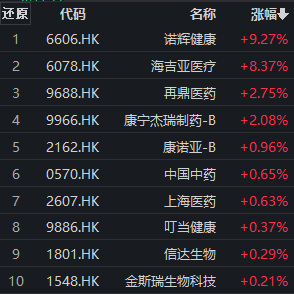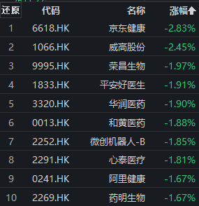 港股方面,医疗医药股跌多涨少。截至发稿,相关指数中,中证港股通医药卫生综合指数 (930965)走低。下跌成分股中,京东健康、威高股份跌超2%,荣昌生物、平安好医生、华润医药等多股跌逾1%;上涨成分股中,诺辉健康涨超9%,海吉亚医疗涨超8%,再鼎医药、康宁杰瑞制药-B涨逾2%。