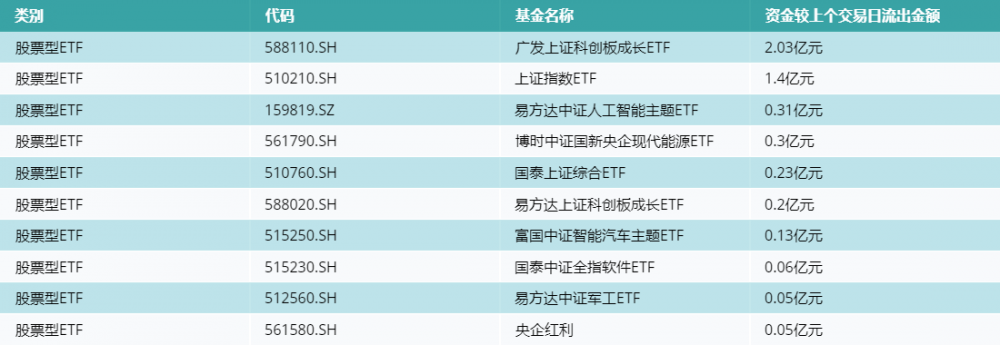 昨日股票型ETF资金流出最多的3支ETF及其流入金额分别为:广发上证科创板成长ETF(流出2.03亿元)、上证指数ETF(流出1.4亿元)、易方达中证人工智能主题ETF(流出0.31亿元)。资金流出前10详情见下表: