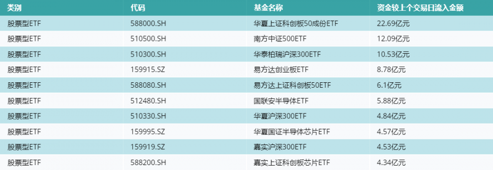 昨日股票型ETF资金流入最多的3支ETF及其流入金额分别为:华夏上证科创板50成份ETF(流入22.69亿元)、南方中证500ETF(流入12.09亿元)、华泰柏瑞沪深300ETF(流入10.53亿元)。资金流入前10详情见下表: