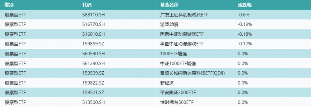 昨日股票型ETF跌幅最大的3支ETF及其收益率分别为:广发上证科创板成长ETF(-0.6%)、游戏动漫(-0.19%)、国泰中证动漫游戏ETF(-0.18%)。跌幅前10详情见下表: