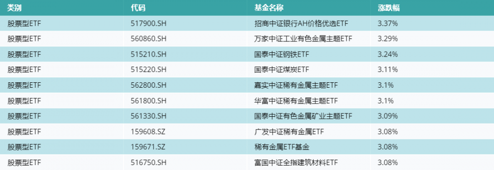 昨日股票型ETF涨幅最高的3支ETF及其收益率分别为:招商中证银行AH价格优选ETF(3.37%)、万家中证工业有色金属主题ETF(3.29%)、国泰中证钢铁ETF(3.24%)。涨幅前10详情见下表: